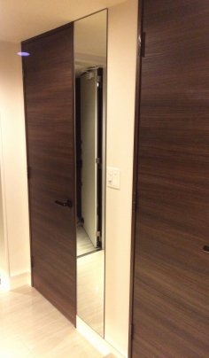マンションの玄関の壁面に大型のミラーを設置しました。