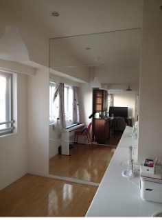 リビングの壁面の一面に大型の1枚サイズのミラーを貼りました。お子様のダンスの練習用としてご両親様からのご要望にお応えする形でご提案をさせていただきました。ミラーの端にはミラーエッジを付けてお子様がケガをされないように保護させていただきました。