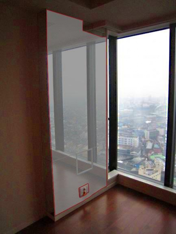出来るだけ壁面全体にミラーを設置するため、カーテンボックス部分にはミラーをL字に切り込み、約30センチ×30センチのパイプスペース点検口にもミラー貼らせていただきました。点検時には開閉することができます。
