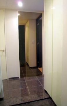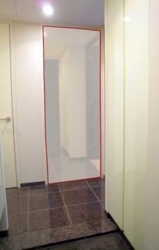玄関にブロンズ色のミラーを設置させていただきました。 実はミラーは「使われることのないドア」の全面に設置されています。2方向からリビングに出入りする間取りで、1方のドア全面にミラーを設置させていただきました。