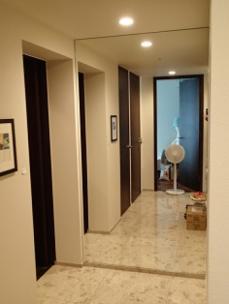玄関から室内への導線がクランクしていてやや圧迫感がありました。 玄関壁面いっぱいのミラーを貼ることで廊下の奥行き感が出ました。またダウンライトでの明るさもミラーの反射効果でより空間は明るくなりました。 お客様には大変喜んでいただきました。ありがとうございました。