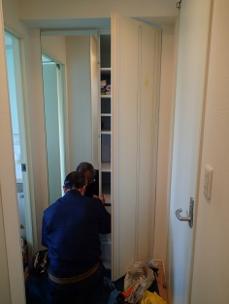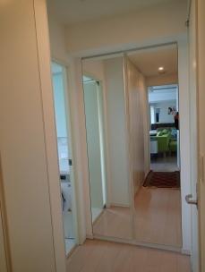 玄関廊下のクローゼットの左右の扉2枚にミラー貼りしました。扉の軽量化の観点から厚さは3ミリの薄いタイプを使用しました。幅48cm、高さは203cmの扉と同サイズのミラーを貼りました。 廊下部分の奥行き感が出て空間が変わりました。お客様には大変喜んでいただきました。